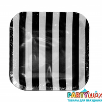 Тарелка квадратная Черная полоска для проведения дня рождения. Тарелки входят в состав коллекции ПОЛОСАТАЯ ВЕЧЕРИНКА товаров для проведения праздников. Упаковка - 12 шт. -