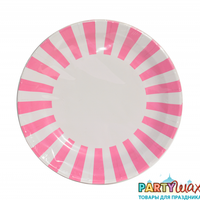 Тарелка круглая Розовая полоска для проведения дня рождения. Тарелки входят в состав коллекции ПОЛОСАТАЯ ВЕЧЕРИНКА товаров для проведения праздников. Упаковка - 12 шт. -