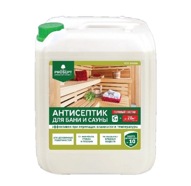 Антисептик PROSEPT ECO SAUNA - это высокоэффективная композиция синтетических биоцидов нового поколения на водной основе. В составе используются вещества, применяемые для обеззараживания и дезинфекции в медицине и на пищевых производствах. Активные компоненты препарата хорошо проникают и связываются с клеточной тканью древесины, обеспечивая тем самым устойчивость к конденсационному увлажнению и быстрому вымыванию. Срок защиты во многом зависит от интенсивности эксплуатации. В помещениях, где отсутствует риск прямого действия влаги, гарантированный срок защиты может составить 10 лет. В саунах, где используется «сухой пар», рекомендуется проводить профилактическую обработку каждые 3-5 лет. В парных и моечных профилактику следует проводить раз в 2-3 года.