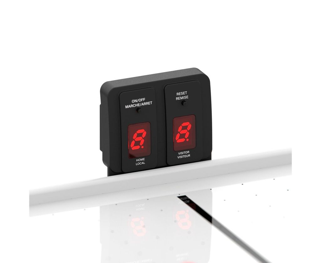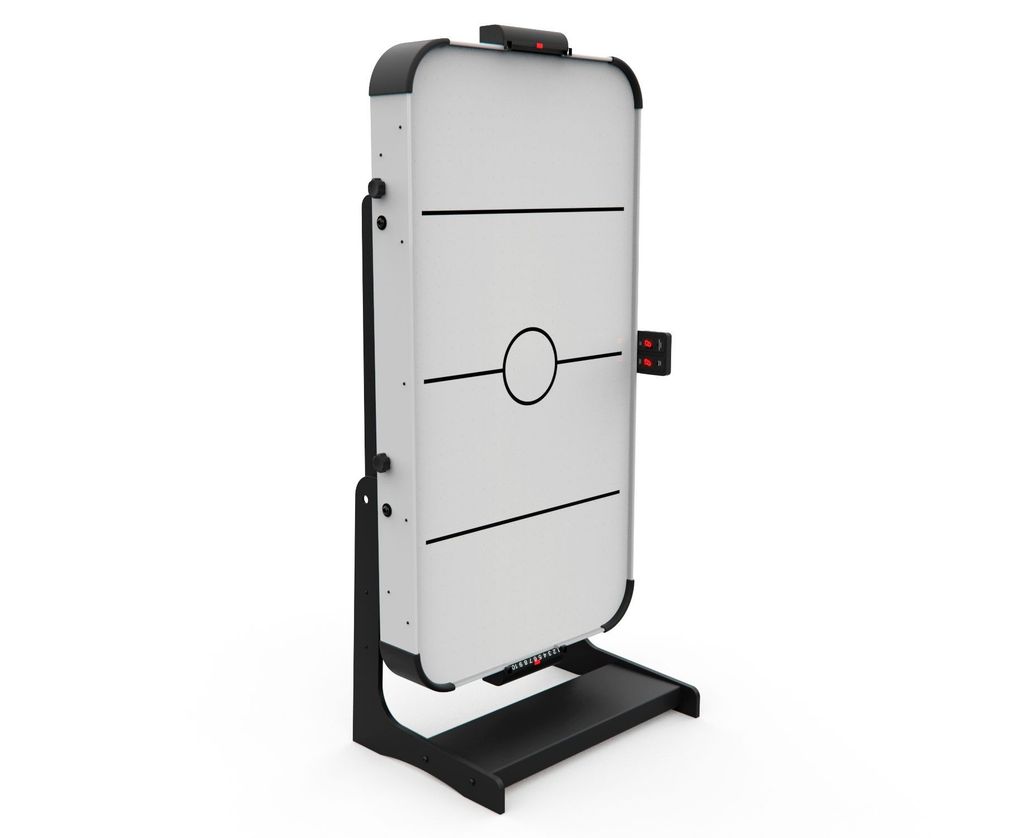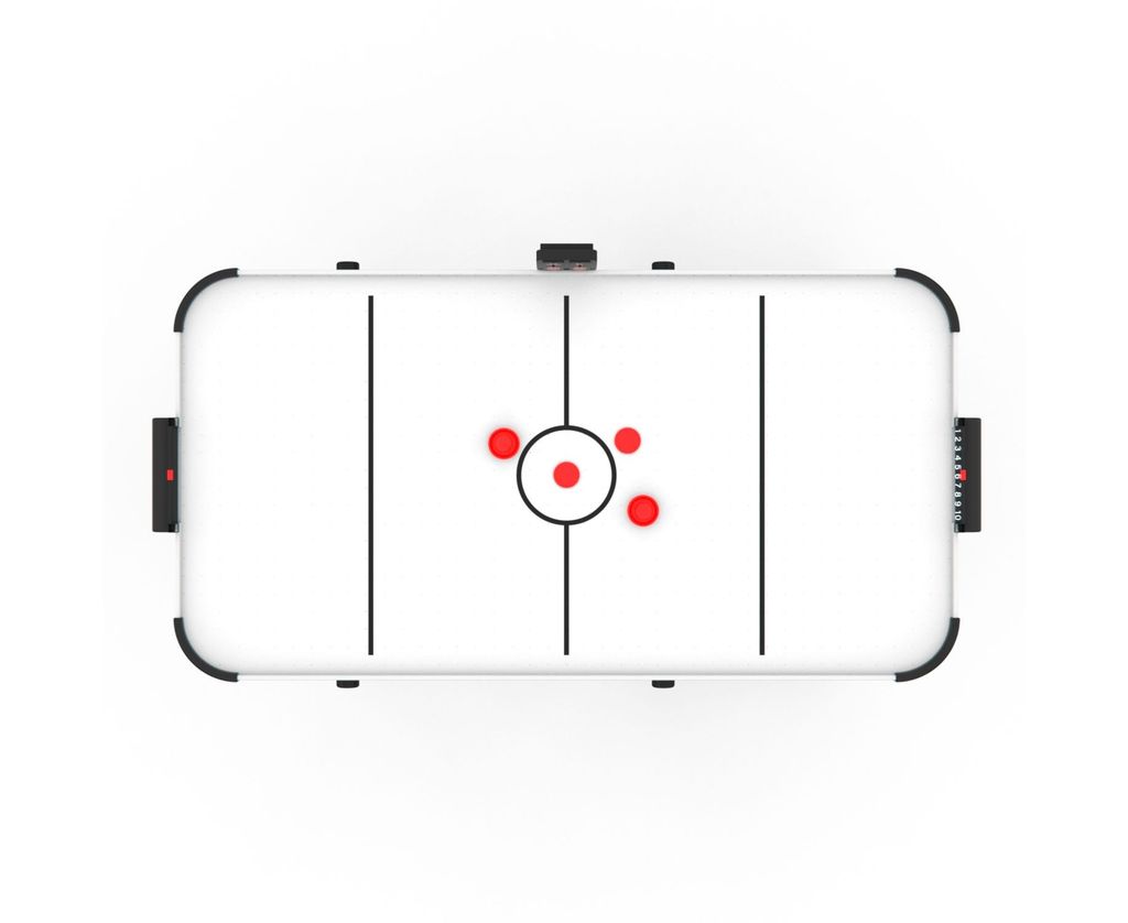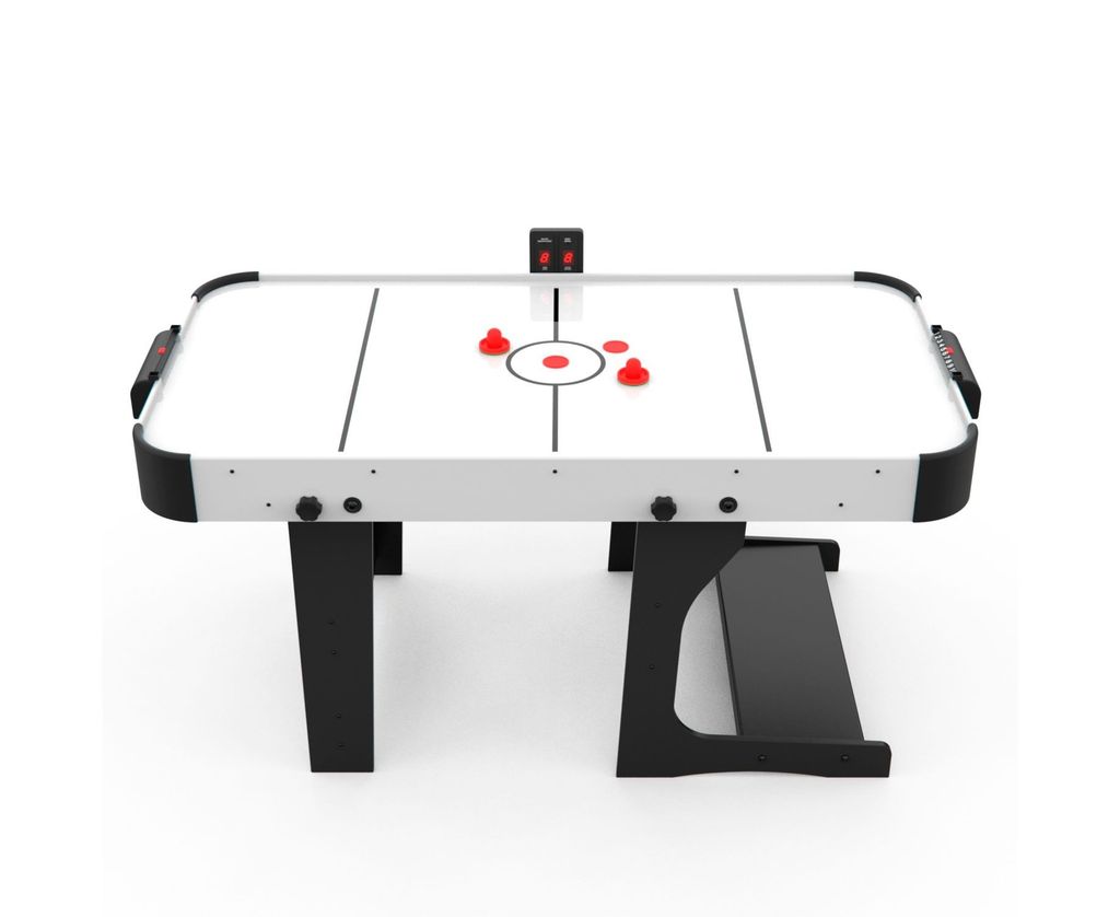 Стол оборудован электронным табло для подсчета очков. Питание счетчика: 2 батарейки, тип ААА. Складная конструкция позволит экономить место в перерывах между играми. Корпус выполнен из специально обработанного МДФ, сверху покрытого прочным пластиком. Мощный компрессор подает воздух через отверстия. Напряжение 220В.