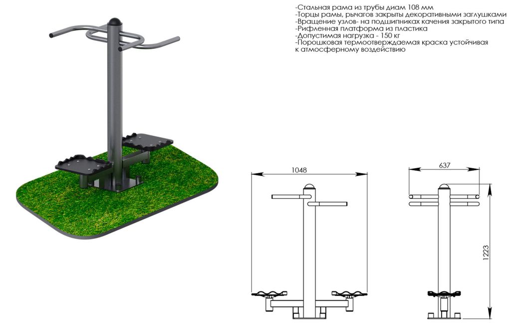 - Стальная рама из трубы диаметром 108мм, имеет сферическую пластиковую заглушку;