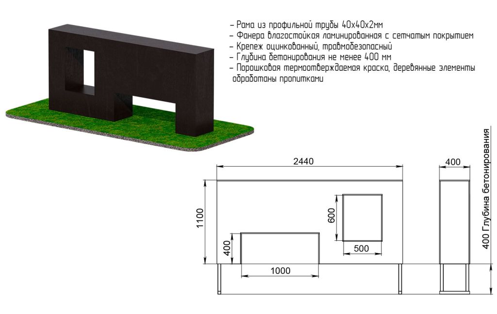 • Элемент полосы препятствий «Стенка с двумя проломами» состоит из стального цельносварного каркаса обшитого влагостойкой фанерой.