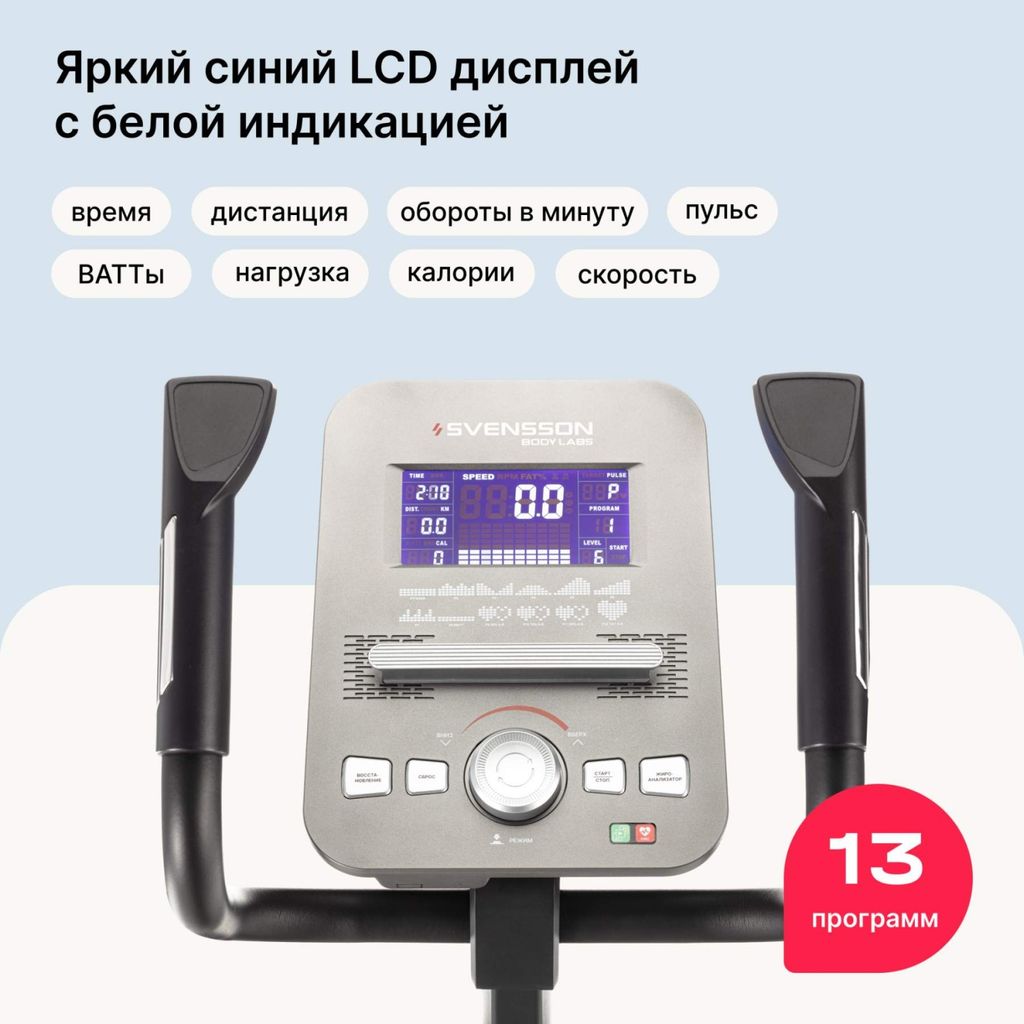 Яркий синий LCD дисплей с белой индикацией, отображающий все необходимые показатели, включая время, скорость, дистанцию, калории, пульс, нагрузку, обороты в минуту, ВАТТы, позволяет вам максимально контролировать тренировочный процесс. 13 предустановленных программ — включая быстрый старт, ручной режим, пульсозависимые программы, жироанализатор и пользовательский режим, делают вашу тренировку на SVENSSON BODY LABS TITAN еще более увлекательным и результативным занятием.