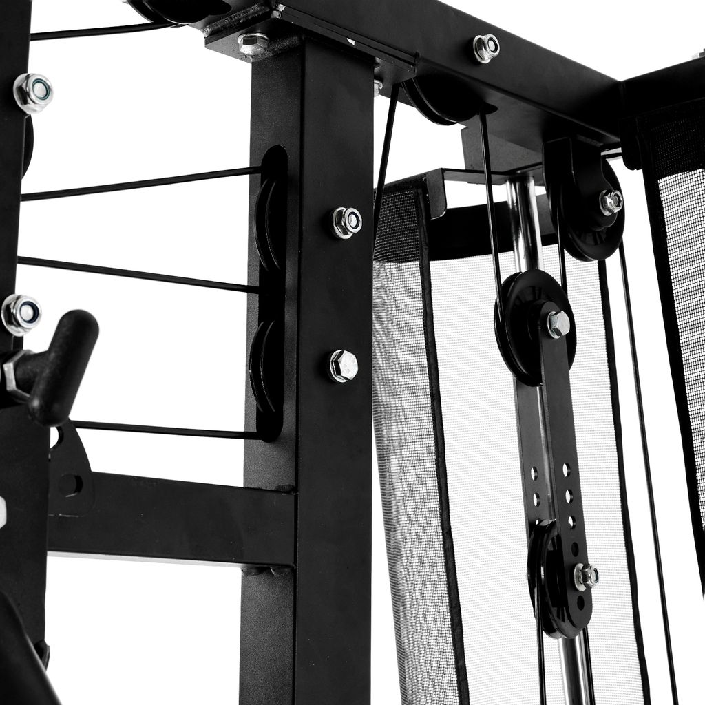 - Верхняя тяга (W-образный гриф в комплекте). Ручки грифа рифлёные, с нескользящей поверхностью. Максимальная нагрузка — 130 кг. Используется для тренировки мышц рук (бицепс, трицепс) и спины.