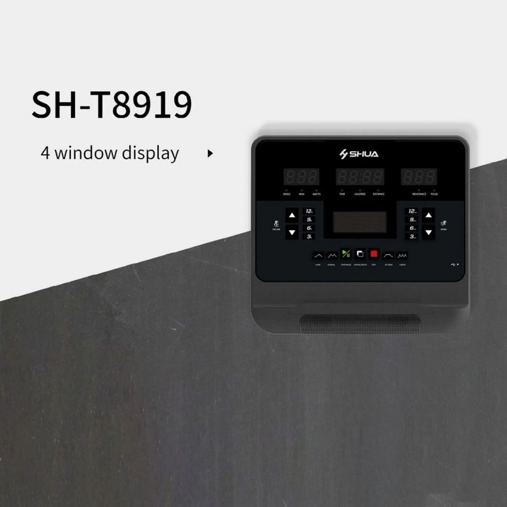 Беговая дорожка SHUA SH-T8919 - современная беговая дорожка для интенсивного использования в фитнес клубах и спортивных залах, также подходит и для домашнего использования. Оснащена надежным и бесшумным мотором - экономичным и, при этом, выдерживающим большие нагрузки. Беговая дорожка SH-T8919 выдерживает нагрузку до 180 кг, благодаря прочной раме и мощному двигателю. Пользователю дорожки доступны несколько программ тренировки - пульсозависимые, интервальные, пользовательские и высокоинтенсивные тренировки с наклоном от -3% до 15%. Скорость дорожки - от 0,8 до 20 км/ч.