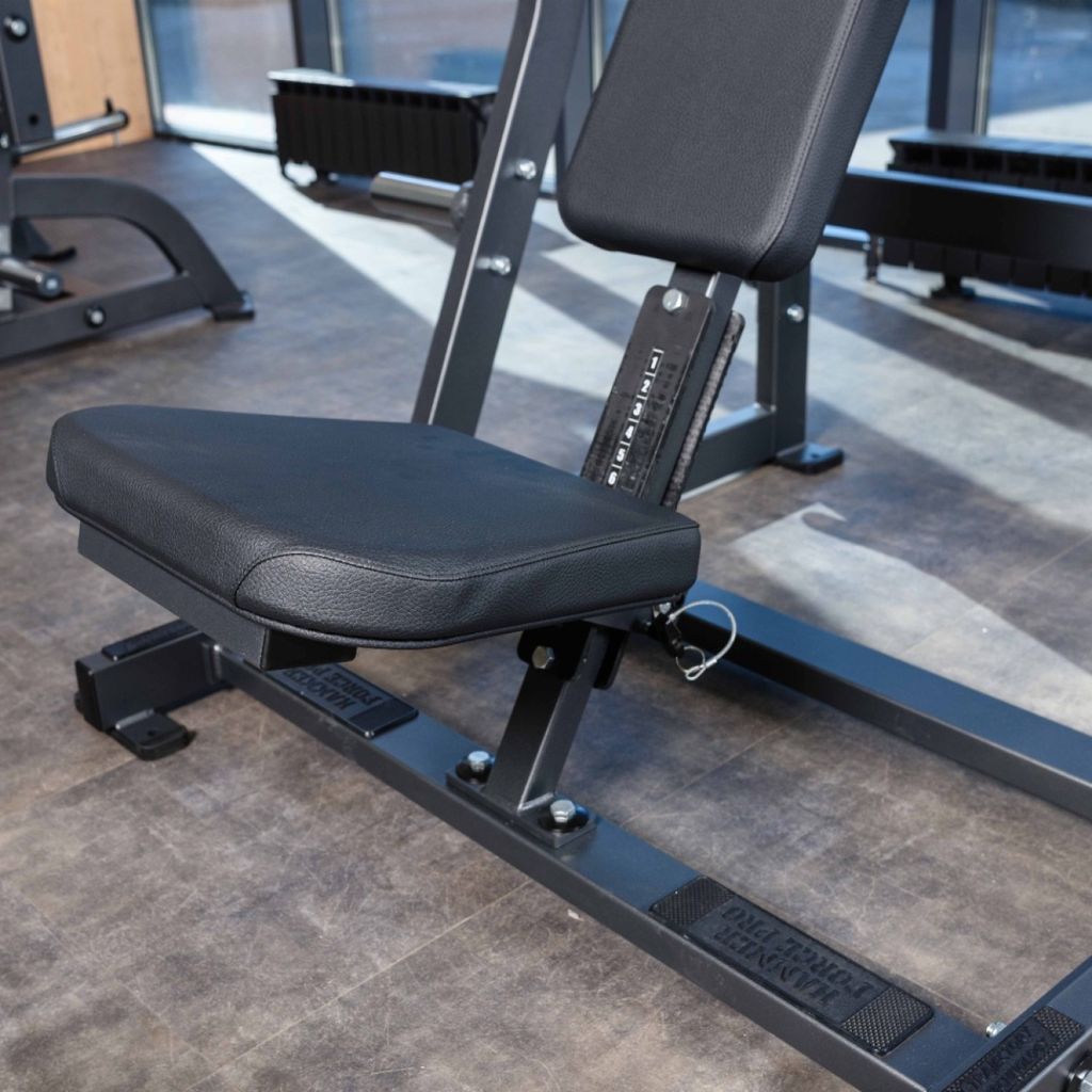 Независимый жим от груди задействует большие грудные мышцы, передние дельтовидные мышцы. Сходящаяся траектория движения рычагов поддерживает нагрузку на целевые мышцы на протяжении выполнения упражнения как в начальной, так и в конечной точке.