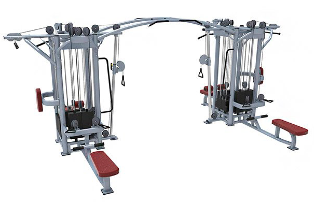 • The 8-Stack multi-station that combines a cable crossover, two long pulls, triceps push down, dip/chin assist, pull down, adjustable hi/lo.
