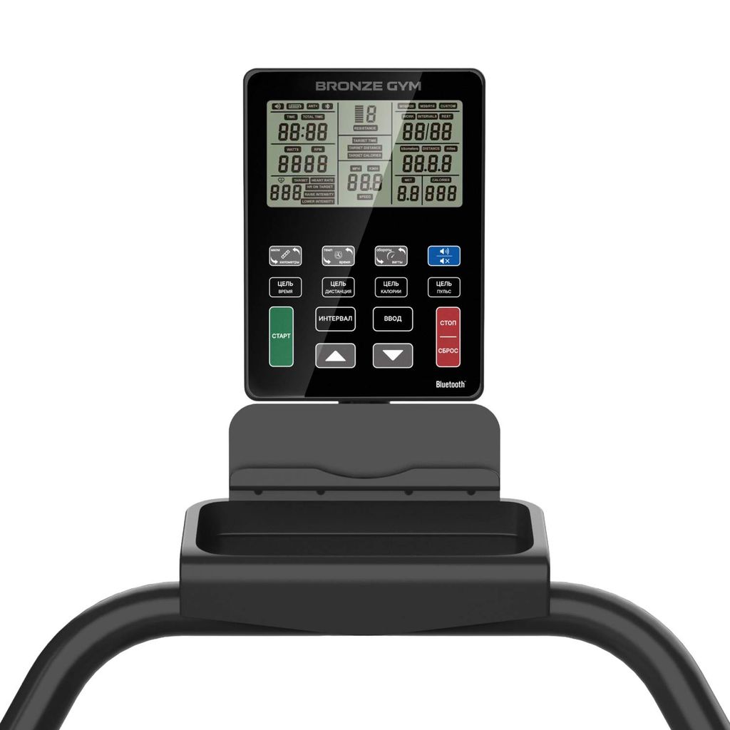 Показания консоли время, скорость, дистанция, калории, пульс, обороты, ватты, сопротивление, темп