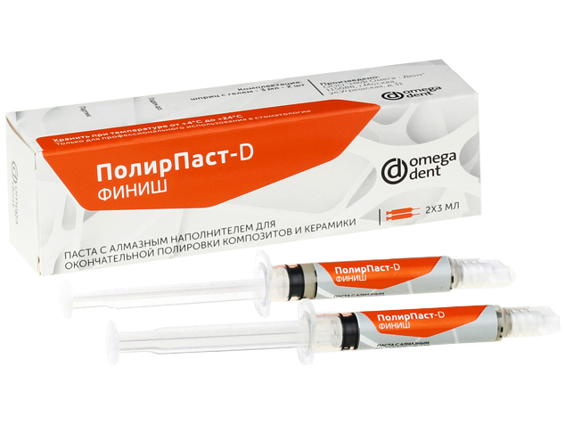 Паста ПолирПаст-D-финиш с алмазным наполнителем для окончательной полировки композитов и керамики, 2 шприца*3 мл, Россия (НКФ Омега-Дент) ОД-ЛПМ-3