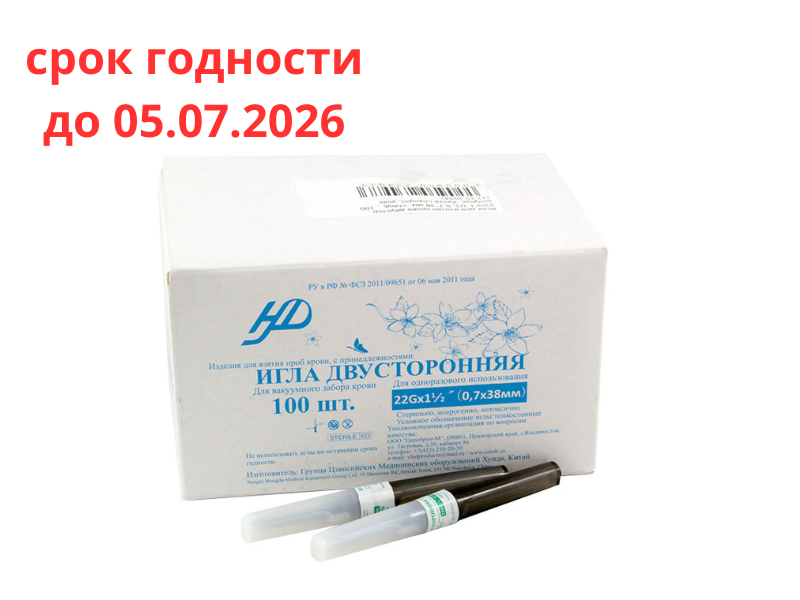 Игла для взятия проб крови двусторонняя, 22G*1 1/2, (0,7*38 мм), стандартная, 100 шт/упак., Китай (Jiangxi Hongda Medical Equipment Group Ltd)