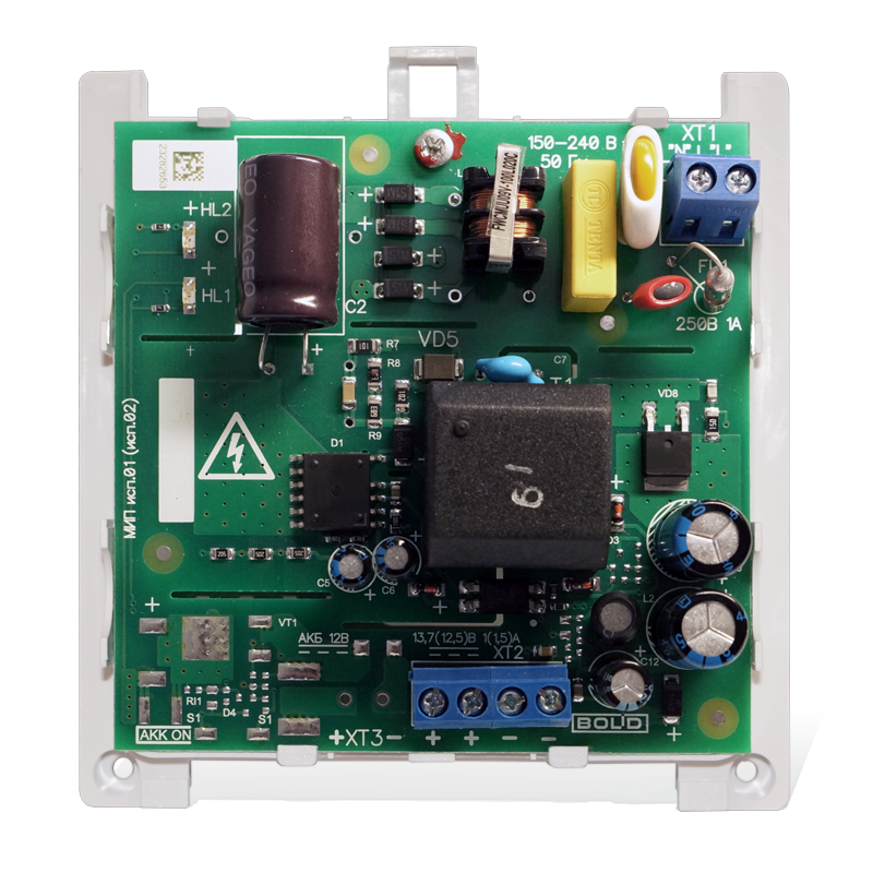МИП-12 исп.01 (МИП-12-1/7ПЗ) модуль источника питания, 12В, 1А. Расширенный диапазон сетевого напряжения. Возможность подключения аккумулятора от 4,5 до 12Ач. Компактный пластиковый корпус, не поддерживающий горения