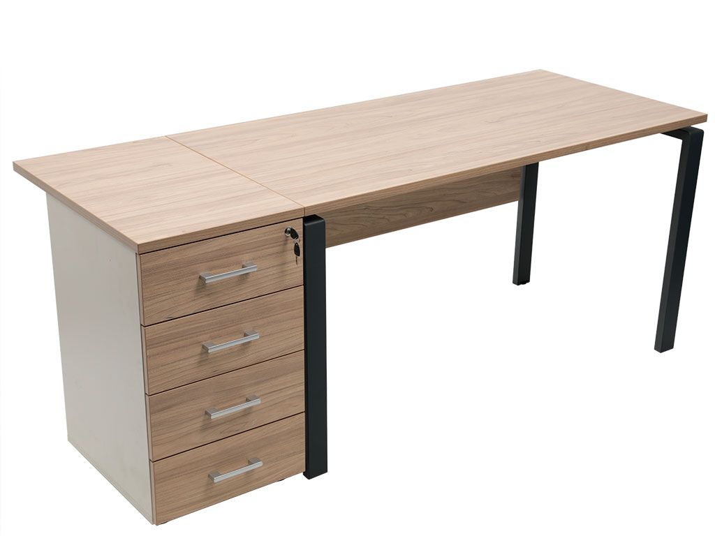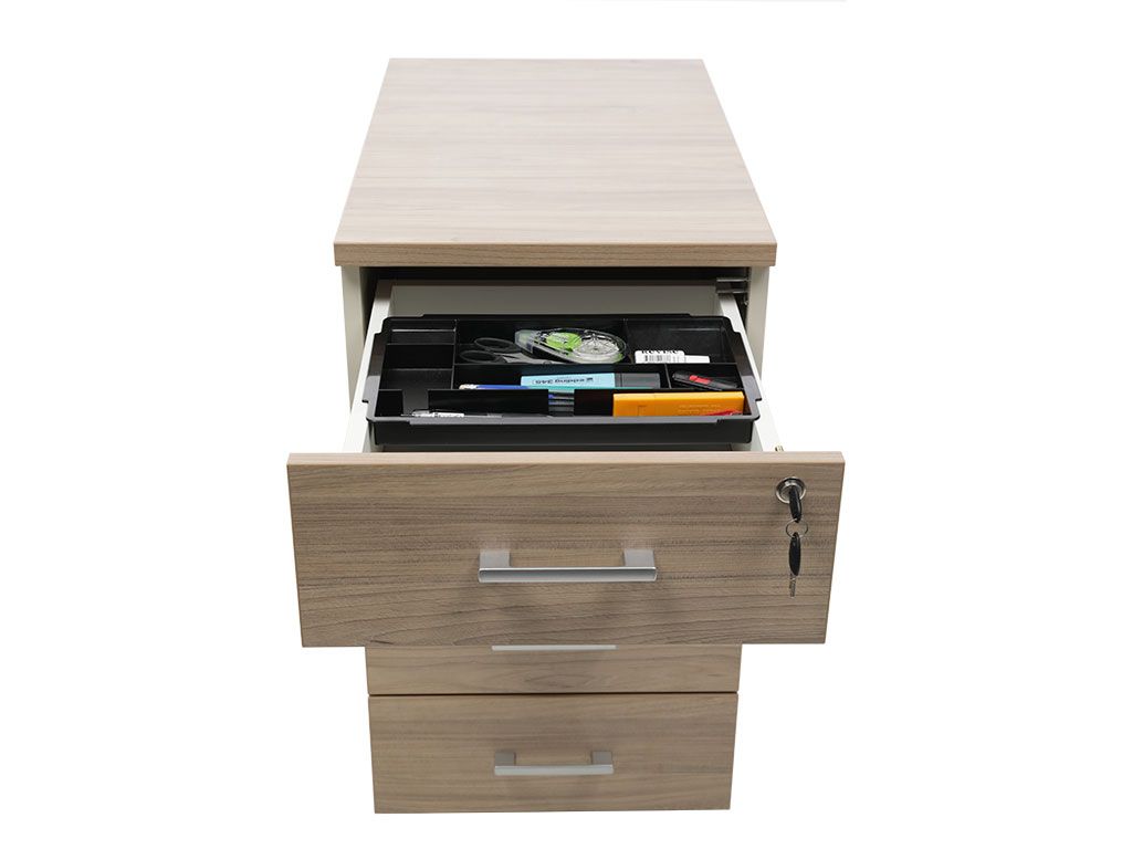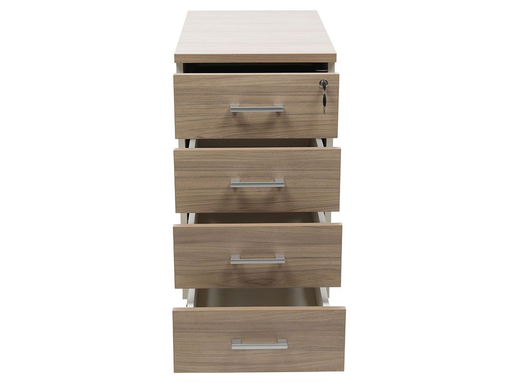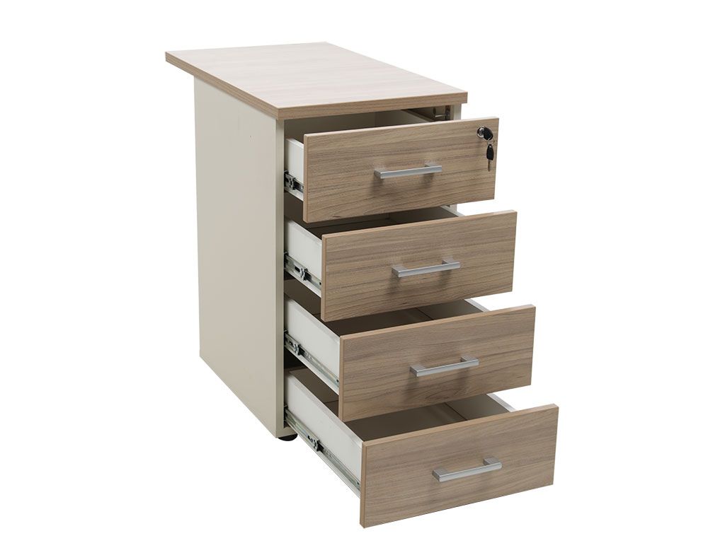 Максимальная нагрузка на ящик, кг: 8. Количество ящиков, шт: 4. Корпус и фасады выполнены из ЛДСП толщиной 18 мм. Топ из ЛДСП толщиной 25 мм, лазерная ABS кромка толщиной 2 мм. Ящики выполнены из ЛДСП и оснащены шариковыми направляющими полного выдвижения. Тумба снабжена замком и пластмассовым лотком для канцелярских принадлежностей в верхнем ящике. Возможность крепления к столу как слева, так и справа. Поставляется в собранном виде.
