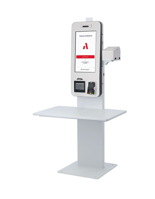 Компактное расположение. Касса подходит для компактного острова самообслуживания. Ее можно установить на напольную, настольную стойку или тумбу. Крепления позволят расположить периферийные устройства так, чтобы соблюдался баланс удобства для покупателя и экономии пространства.
