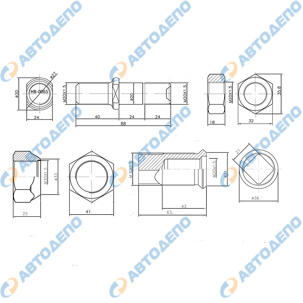 ШПИЛЬКА: М20*31/М20*24, ОБЩАЯЯ ДЛИНА: 88, СПИЛЫ: D30/24, ФУТОРКА: М20/М30, ПРАВАЯ, КЛЮЧ: 21, ЮБКА: 36, ГАЙКА КОЛЕСА: М30, ПРАВАЯ, КЛЮЧ: 41, ГАЙКА ВНУТРЕНЯЯ: М20, КЛЮЧ: 32