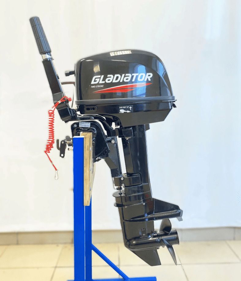 ГЛАДИАТОР G 9.8FHS — 2-х тактный подвесной лодочный мотор мощностью 9.8 л.с. Мотор питается от внешнего топливного бака, с которым соединяется топливным шлангом через быстроразъемные коннекторы (возможно переключение с одного бака на другой без выключения двигателя). В качестве топлива используется заранее подготовленная смесь (предварительное смешивание) в соотношении 50:1 (на 50 л. бензина — 1 л. масла). Для облегчения запуска холодного двигателя в конструкции карбюратора предусмотрена воздушная заслонка. Для контроля работы системы охлаждения на моторе установлена специальная форсунка. Для поддержания стабильной рабочей температуры двигателя в систему охлаждения встроен термостат. Мотор запускается ручным стартером и управляется стандартным румпелем с поворотной ручкой газа (гашеткой мотоциклетного типа) с антипроскальзывающими насечками.