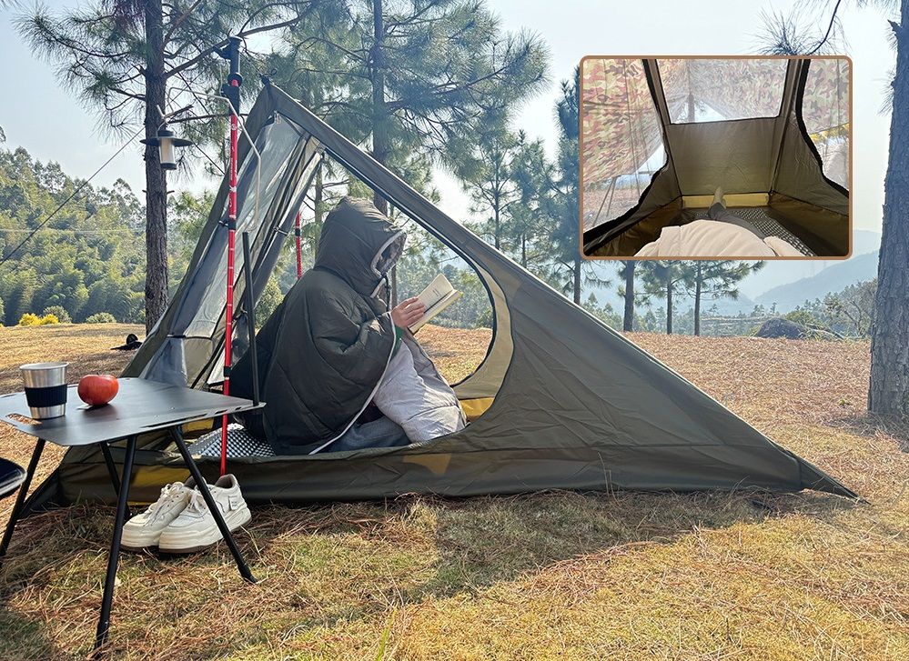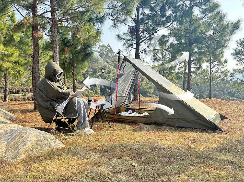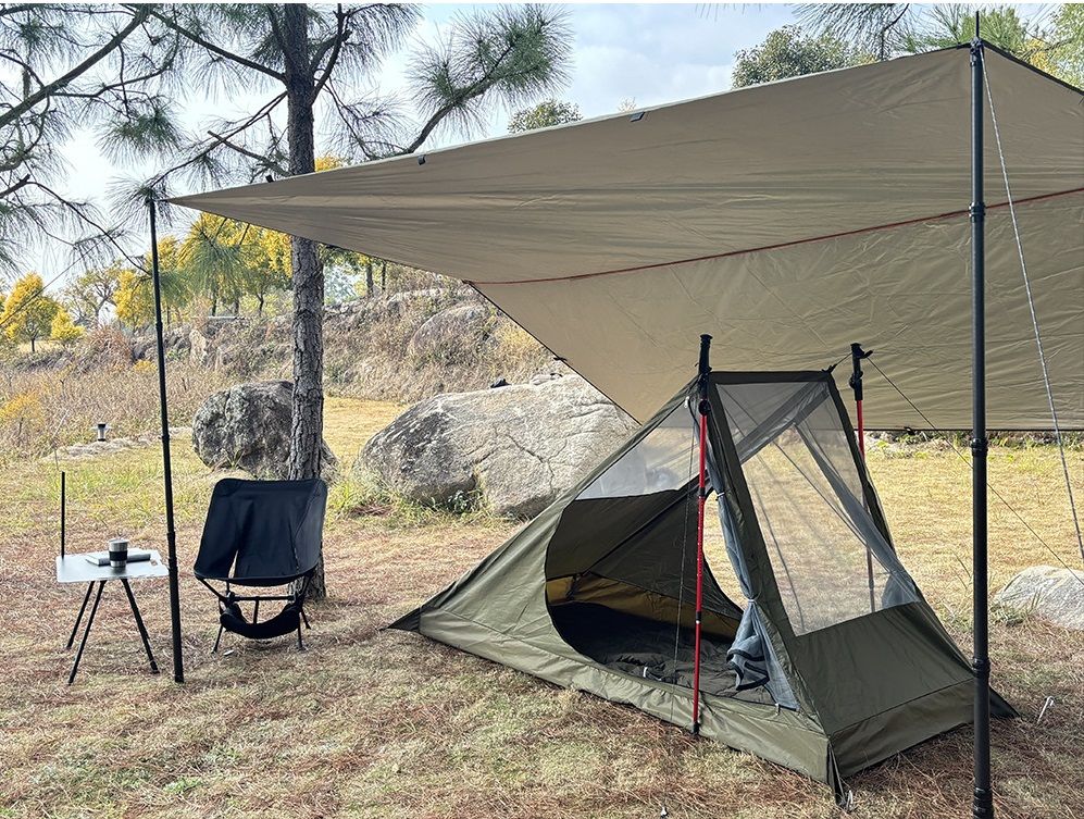 Обратите внимание в комплект не идет тент от дождя и стойки, стойки заменяют подручные средства, например трекинговые палки, или деревья.