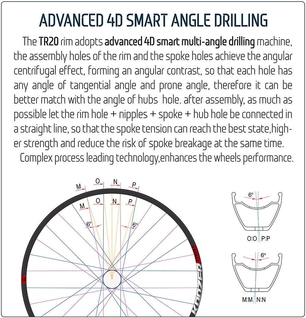 В ободе используется усовершенствованный интеллектуальный многоугловой сверлильный станок 4D, монтажные отверстия обода и отверстия для спиц достигают углового центробежного эффекта, образуя угловой контраст, так что каждое отверстие имеет любой угол тангенциального угла и угол наклона, поэтому оно может лучше соответствовать углу отверстия ступицы. После сборки, насколько это возможно, дайте отверстию обода + ниппеля + спице + отверстию ступицы быть соединенными по прямой линии, чтобы натяжение спицы могло достичь наилучшего состояния, более высокой прочности и одновременно снизить риск поломки спицы. Комплексная передовая технология процесса повышает производительность колес.