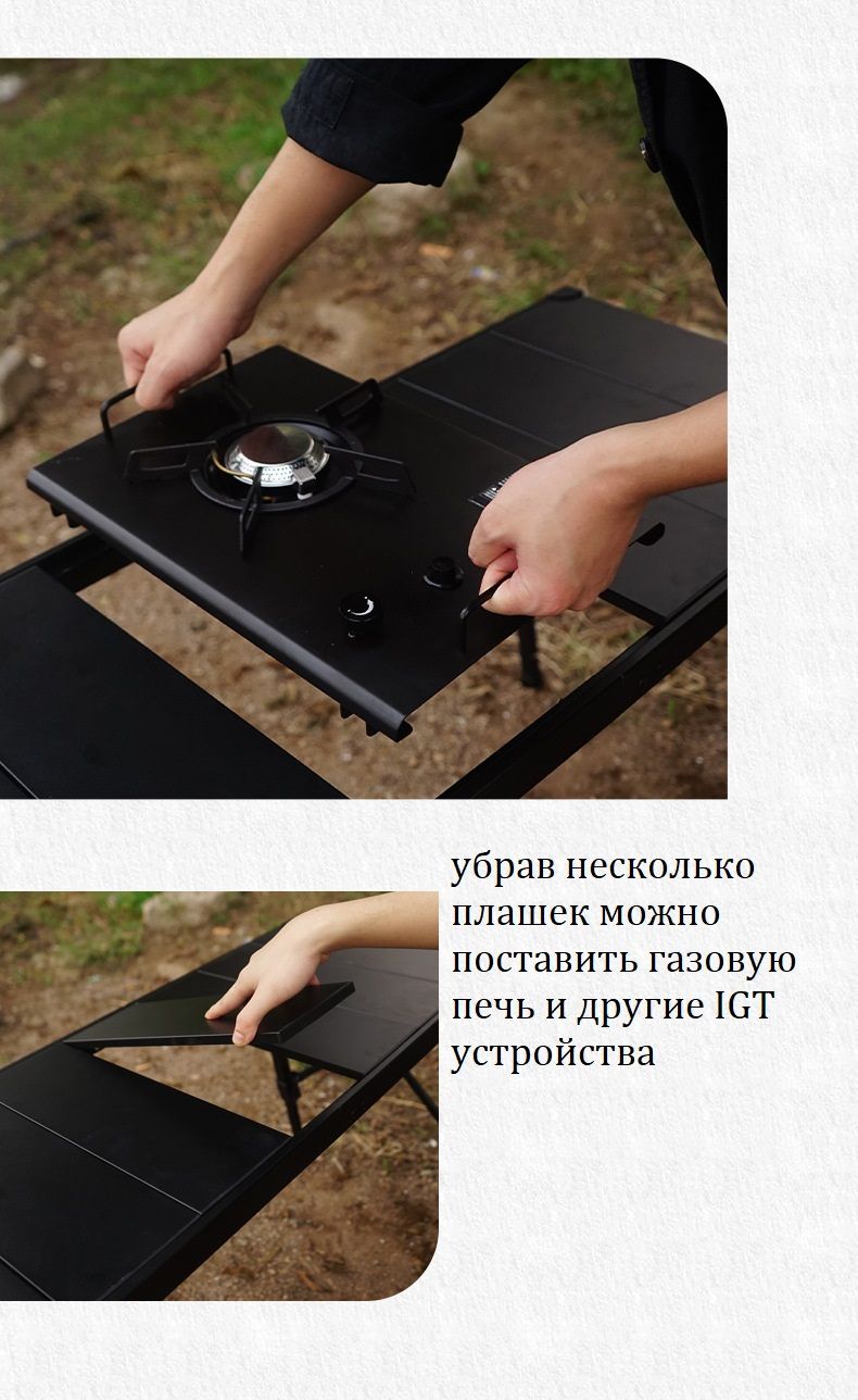 Столы стандарта IGT можно использовать со втираемыми кемпинговыми девайсами, такими газовыми печками, грилями, умывальниками. столешницы данных столов выполнены раздельными плашками, убрав которые можно встроить газовую печь стандарта