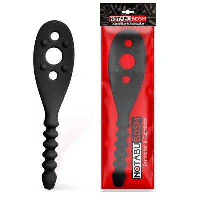 Двойной БДСМ аксессуар для любителей нестандартных эротических развлечений. Совмещает в себе шлёпалку и анальную втулку. Шлёпалка имеет широкую рабочую поверхность с жёсткими шипиками, усиливающими эффект от спанкинга. На шлёпалке имеются отверстия разного диаметра, которые могут отпечатываться на коже. Втулка имеет эргономичную форму ёлочки, способствующую более комфортному введению.