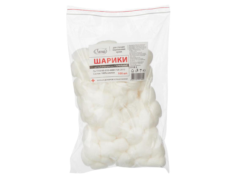 Шарики ватные №100 (70 г) медицинские стерильные (для станций переливания крови), Россия (ООО "Емельянъ Савостинъ. Ватная Фабрика")