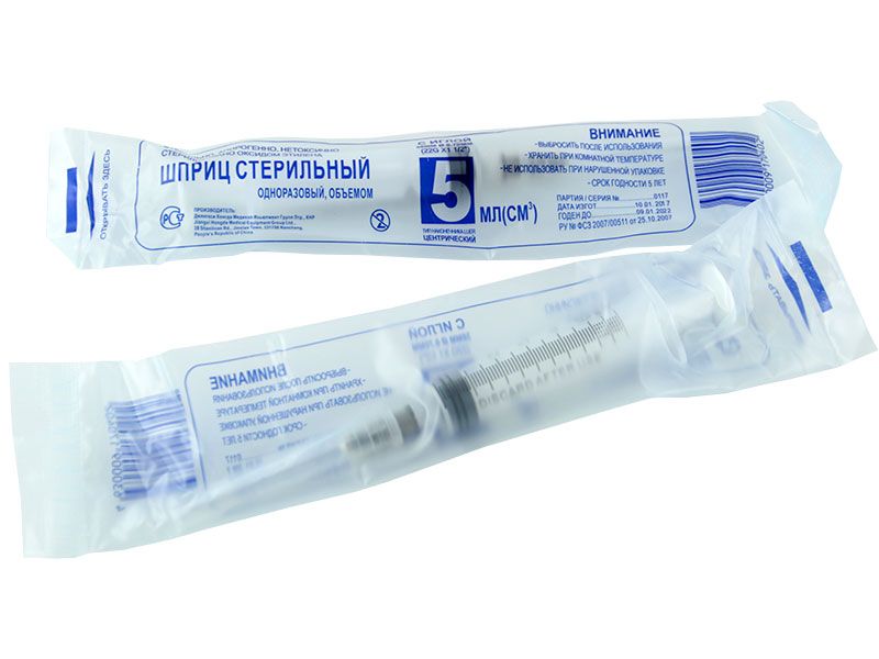Шприц 5 мл (см3) с иглой 22G (0,7*38/40 мм) одноразовый стерильный, 100 шт/упаковка, Китай (Jiangxi Hongda Medical Equipment Group, Ltd)