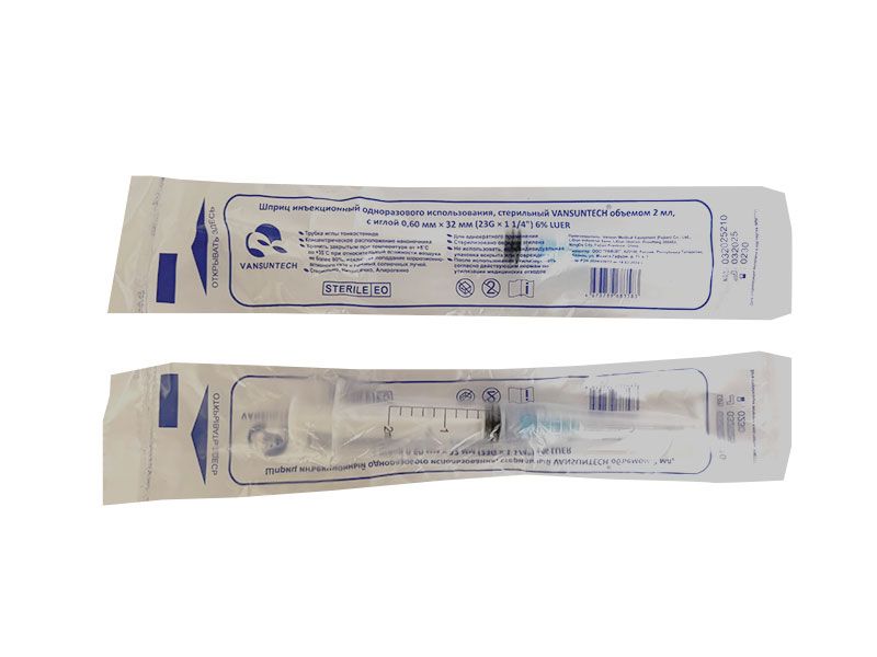 Шприц 2 мл с иглой 23G*1 1/4 (0,6*32 мм) инъекционный одноразового использования стерильный, 100 штук/упаковка, Китай (Vansun Medical Equipment (Fujian) Co., Ltd) 77879