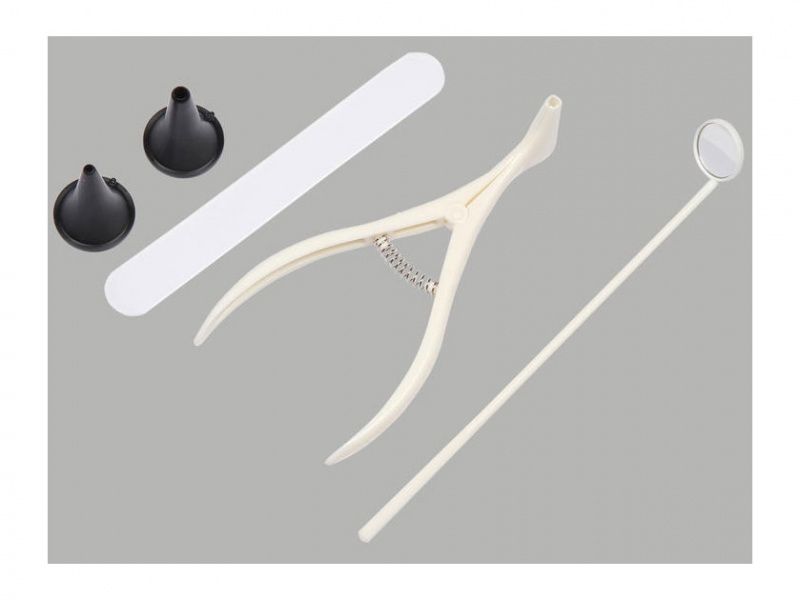 Тип 1. Набор состоит из инструментов: носовое зеркало 1 шт, шпатель для языка 1 шт, гортанное зеркало 1 шт, ушная воронка 2 шт.