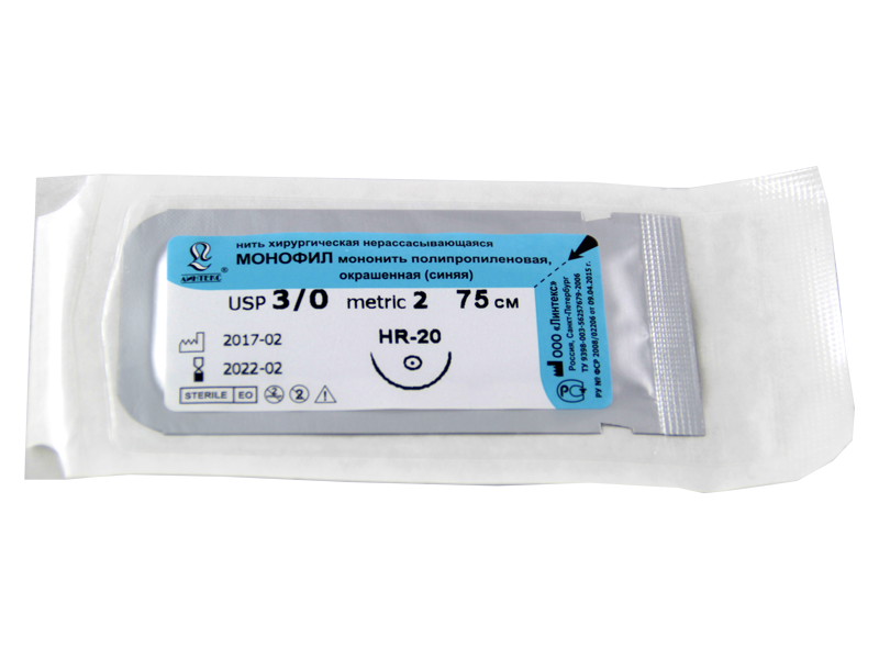 Монофил синий МР(2), USP(3/0), длина 75 см, игла колющая HR-20, 1/2 окружности, Россия (ООО "Линтекс") 13220A200750