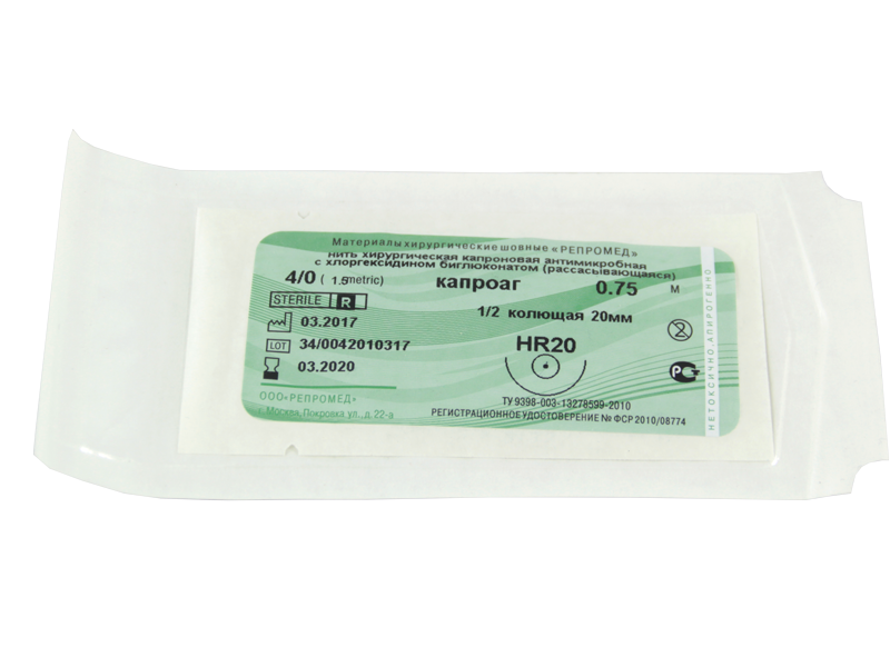 Капроаг (нить хирургическая капроновая антимикробная с хлоргексидином биглюконатом) EP(1,5), USР(4/0), длина 75 см, игла колящая HR20, 1/2 окружность, Россия (ООО "Репромед")