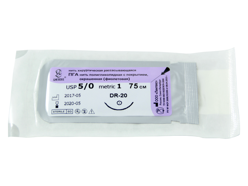 ПГА плетеный фиолетовый МР(1), USP(5/0), длина 75 см, игла колющая DR-20, 3/8 окружности, Россия (ООО "Линтекс") 11010F200750