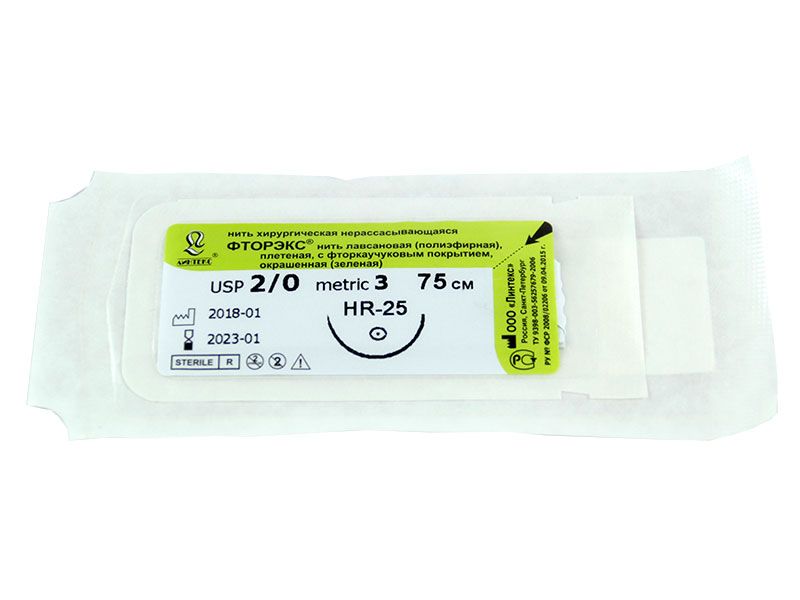 Фторэкс плетеный зеленый МР(3), USР(2/0), длина 75 см, игла колющая HR-25, 1/2 окружности, Россия (ООО "Линтекс") 14430A250750