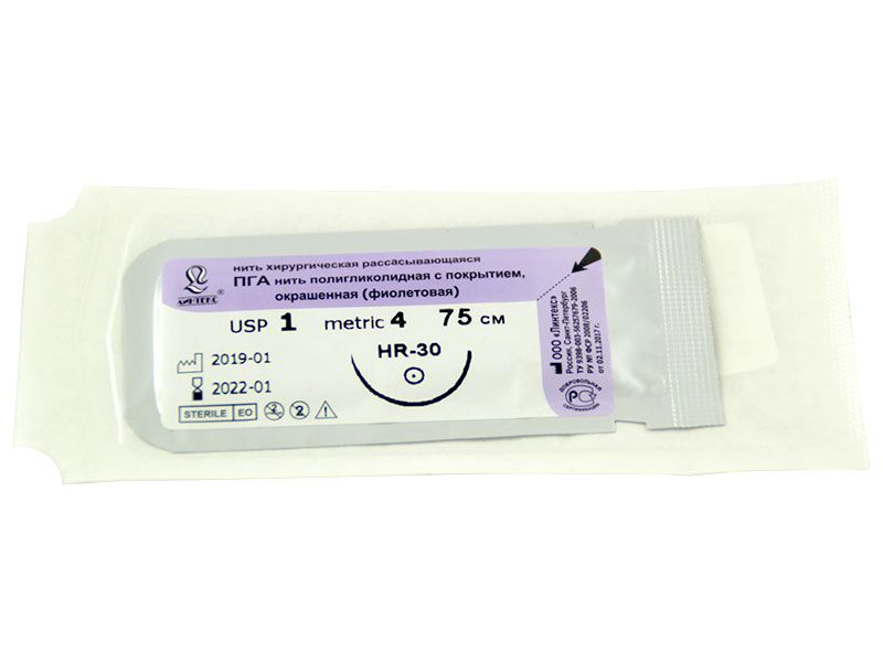 ПГА плетеный фиолетовый МР(4), USP(1), длина 75 см, игла колющая HR-30, 1/2 окружности, Россия (ООО "Линтекс") 11040A300750