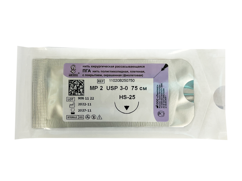ПГА плетеный фиолетовый МР(2), USP(3/0), длина 75 см, игла обратно-режущая HS-25, 1/2 окружности, Россия (ООО "Линтекс") 11020B250750