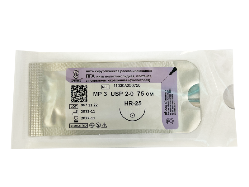 ПГА плетеный фиолетовый МР(3), USP(2/0), длина 75 см, игла колющая HR-25, 1/2 окружности, Россия (ООО "Линтекс") 11030A250750
