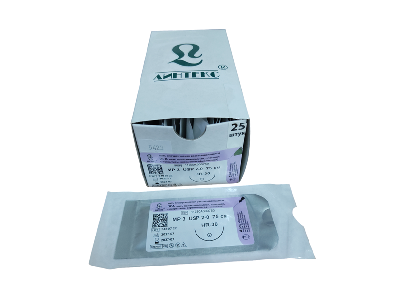 ПГА плетеный фиолетовый МР(3), USP(2/0), длина 75 см, игла колющая HR-30, 1/2 окружности, Россия (ООО "Линтекс") 11030A300750