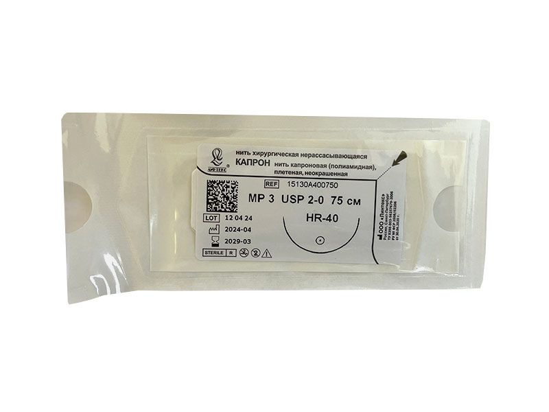 Капрон плетеный неокрашенный МР(3), USP(2/0), длина 75 см, игла колющая HR-40, 1/2 окружности, Россия (ООО "Линтекс") 15130A400750
