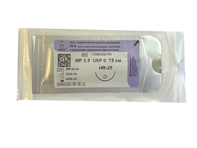 ПГА плетеный фиолетовый МР(3,5), USP(0), длина 75 см, игла колющая HR-25, 1/2 окружности, Россия (ООО "Линтекс") 11035A250750