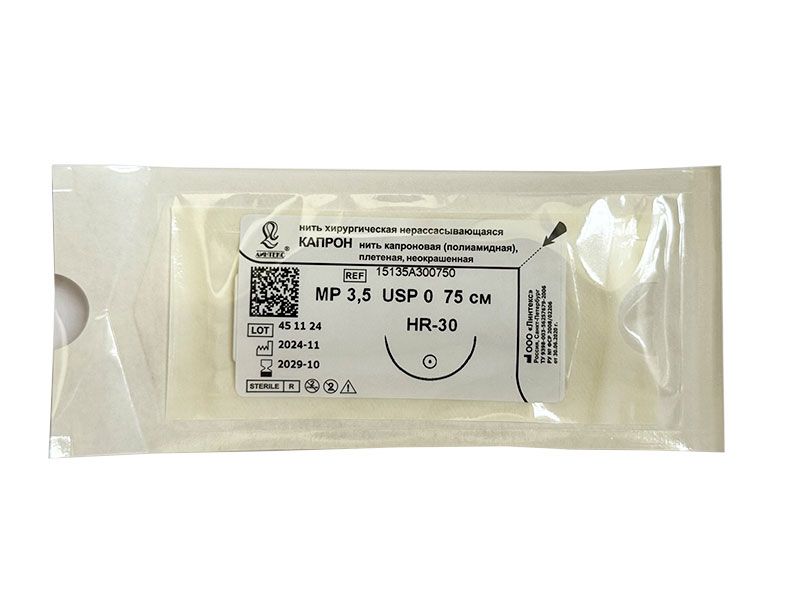 Капрон плетеный неокрашенный МР(3,5), USP(0), 75 см, игла колющая HR-30, 1/2 окружности, Россия (ООО "Линтекс") 15135A300750