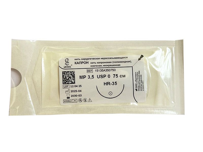 Капрон плетеный неокрашенный МР(3,5), USP(0), 75 см, игла колющая HR-35, 1/2 окружности, Россия (ООО "Линтекс") 15135A350750