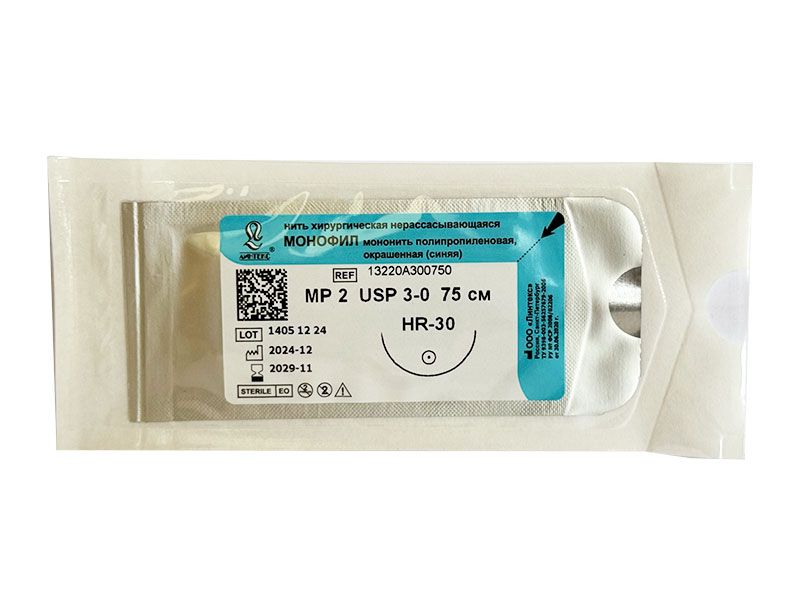 Монофил синий МР(2), USP(3/0), длина 75 см, игла колющая HR-30, 1/2 окружности, Россия (ООО "Линтекс") 13220A300750