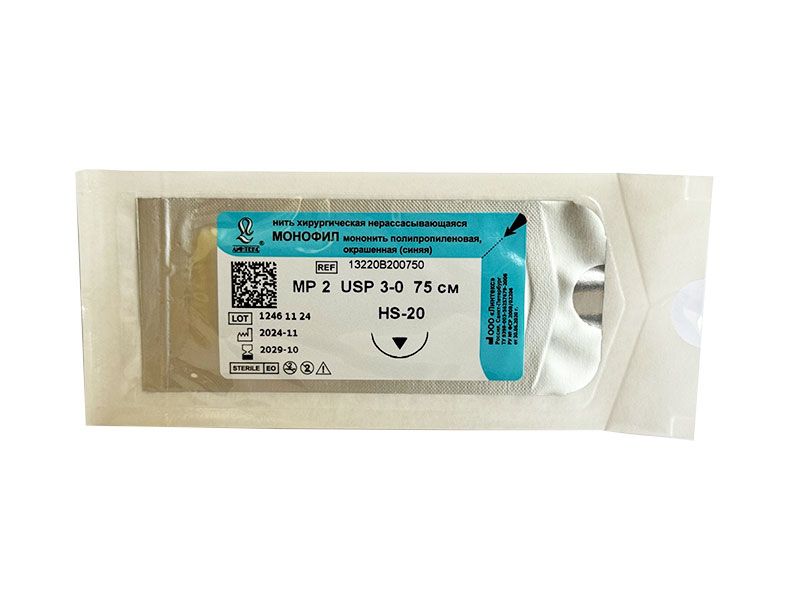 Монофил синий МР(2), USP(3/0), длина 75 см, игла обратно-режущая HS-20, 1/2 окружности, Россия (ООО "Линтекс") 13220B200750