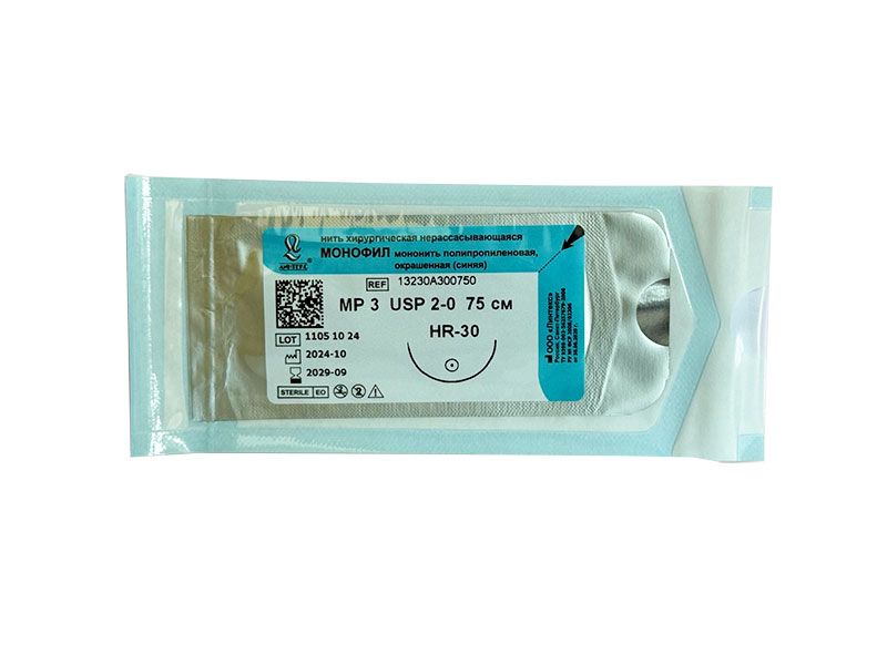 Монофил синий МР(3), USP(2/0), длина 75 см, игла колющая HR-30, 1/2 окружности, Россия (ООО "Линтекс") 13230A300750