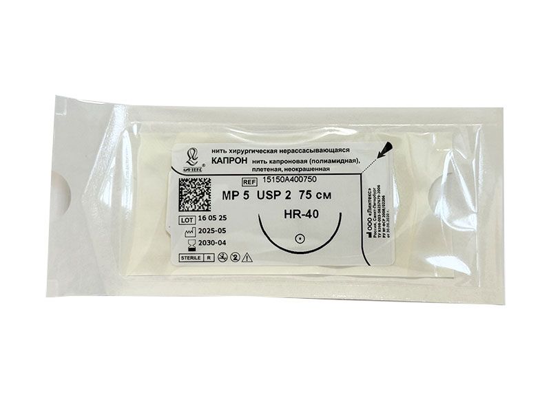 Капрон плетеный неокрашенный МР(5), USP(2), 75 см, игла колющая HR-40, 1/2 окружности, Россия (ООО "Линтекс") 15150A400750