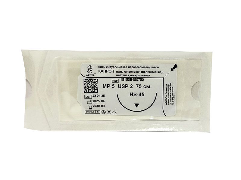Капрон плетеный неокрашенный МР(5), USP(2), 75 см, игла обратно-режущая HS-45, 1/2 окружности, Россия (ООО "Линтекс") 15150B450750