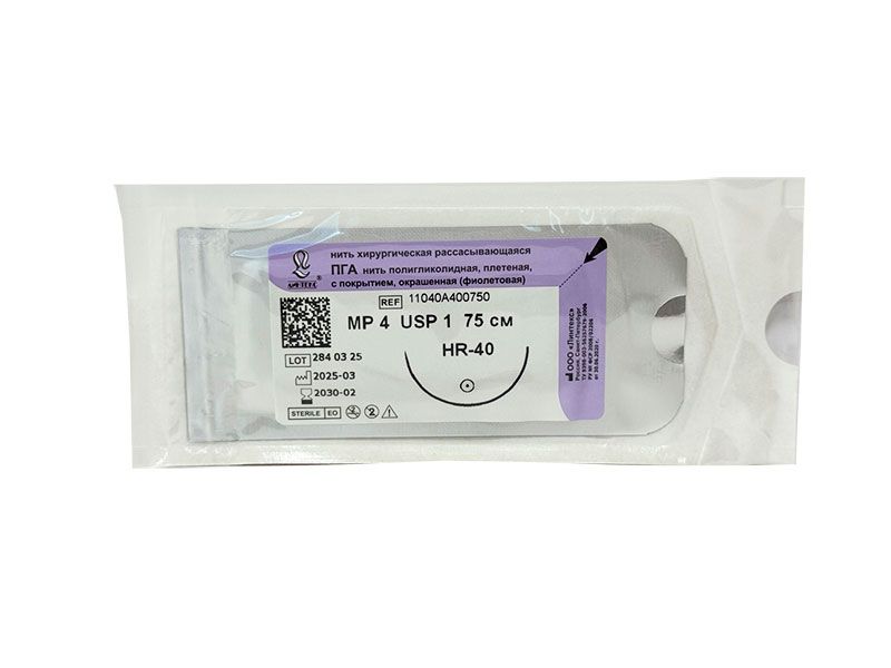 ПГА плетеный фиолетовый МР(4), USP(1), длина 75 см, игла колющая HR-40, 1/2 окружности, Россия (ООО "Линтекс") 11040A400750