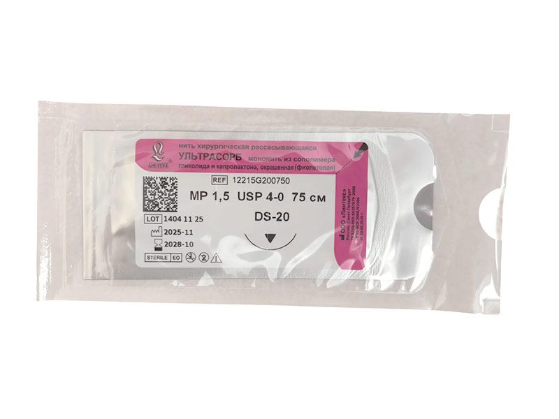 Ультрасорб фиолетовый, МР(1,5) USP(4/0), длина 75 см, игла обратно-режущая DS-20, 3/8 окружности, Россия (ООО "Линтекс") 12215G200750