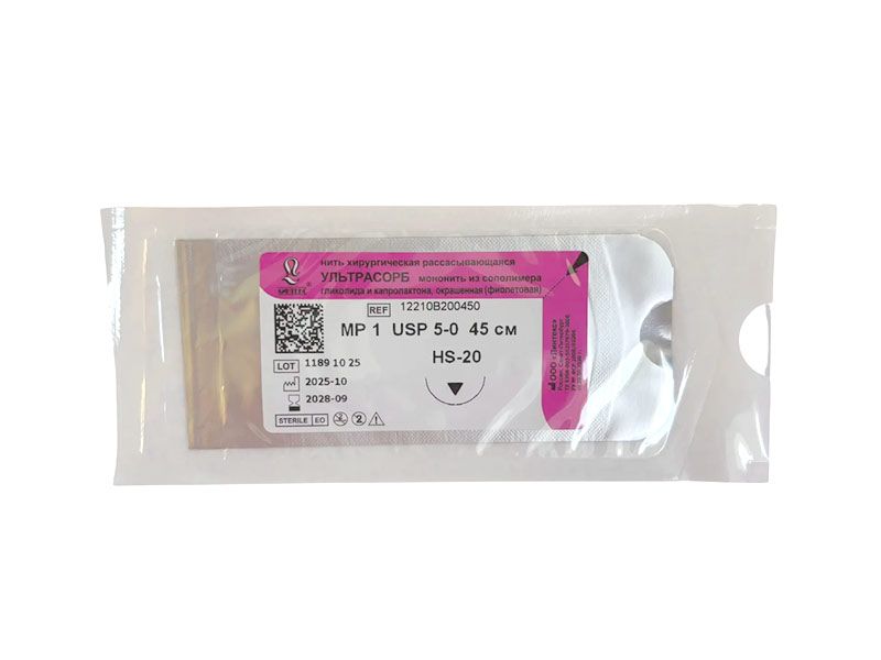 Ультрасорб фиолетовый, МР(1) USP(5/0), длина 45 см, игла обратно-режущая HS-20, 1/2 окружности, Россия (ООО "Линтекс") 12210B200450