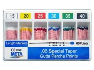 Гуттаперчевые штифты МЕТА - это альфа-гуттаперча с низкой температурой плавления (в последнее время все более популярной становится более текучая и липкая альфа-гуттаперча, обеспечивающая при использовании ее в разогретом состоянии более гомогенное заполнение всей разветвленной системы корневого канала).