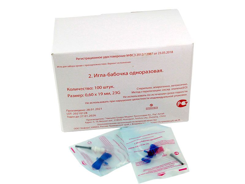 Игла-бабочка 23G*3/4, 0,6*19 мм с луер-адаптером (для вакуумного забора крови), длина 30 см., 100 штук/упаковка, Китай ("Zhejiang Gongdong Medical Technology Co., Ltd")