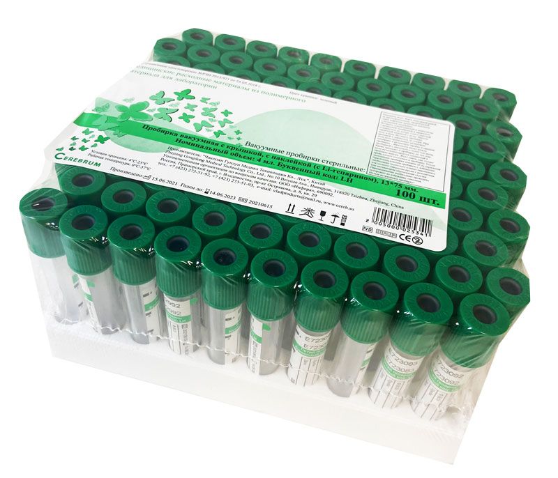 Пробирка вакуумная 13х75 мм с крышкой, с наклейкой (с Li-гепарином), объемом 4 мл, 100 штук/упаковка, Китай ("Чжецзян Гундун Медикл Текнолоджи Ко., Лтд.")